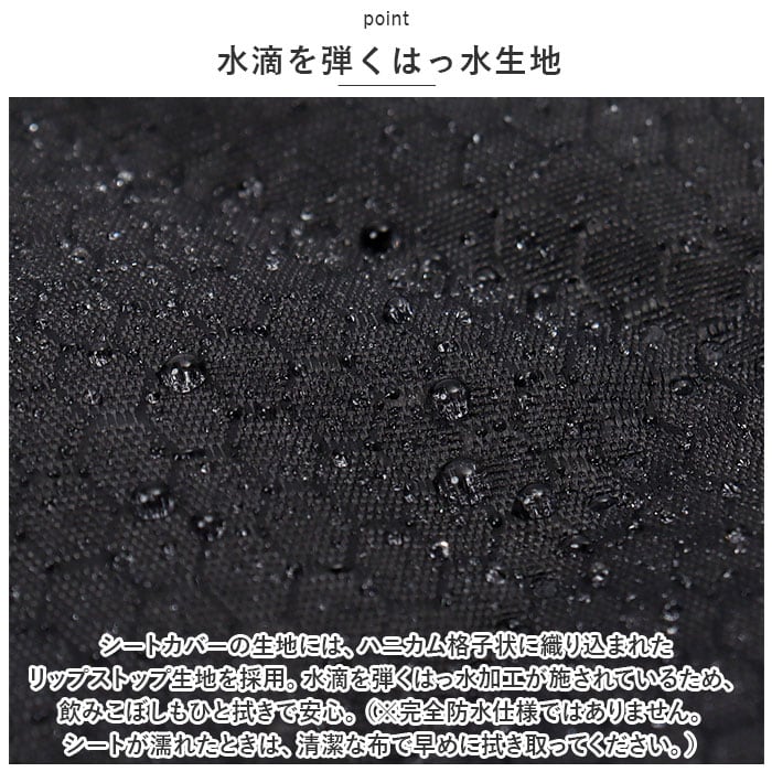 ・シートカバーの生地には、ハニカム格子状に織り込まれたリップストップ生地を採用。水滴を弾くはっ水加工が施されているため、ドリンクの飲みこぼしもサッとひと拭きで安心。(※完全防水仕様ではありません。シートが濡れたときは、清潔な布で早めに拭き取ってください。)