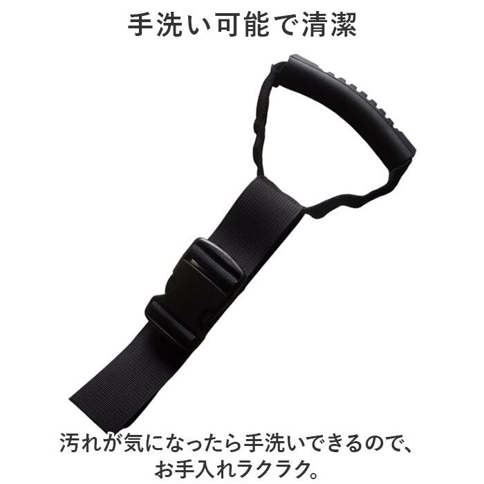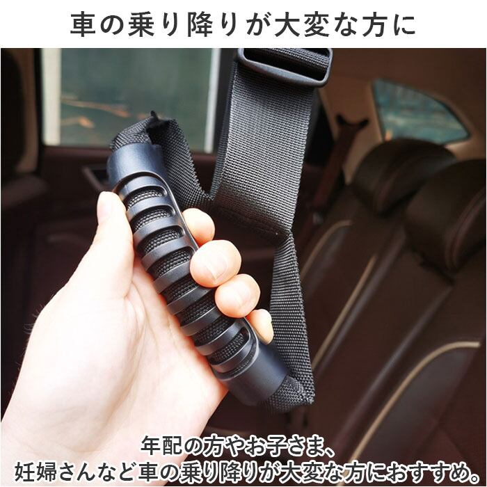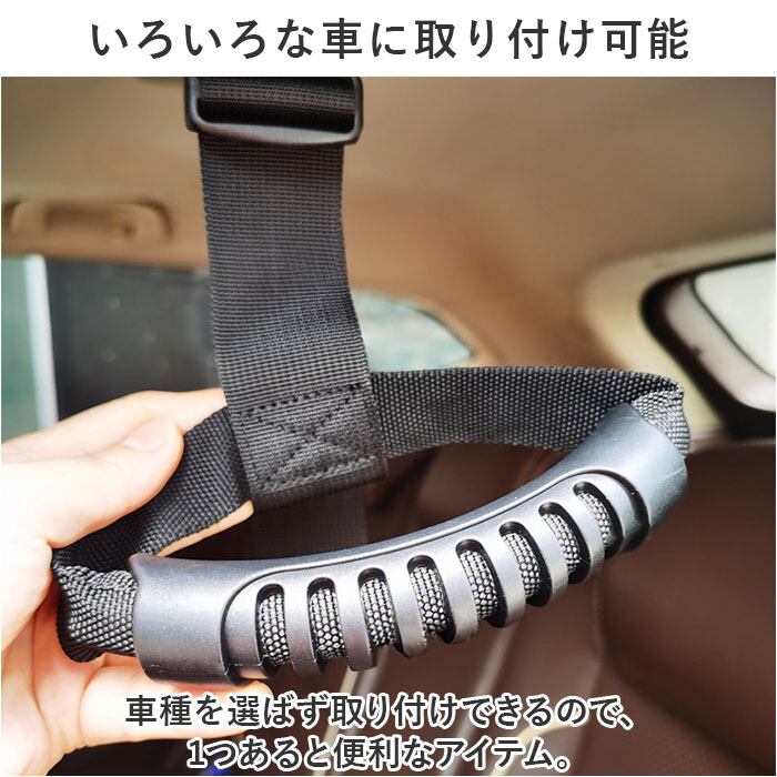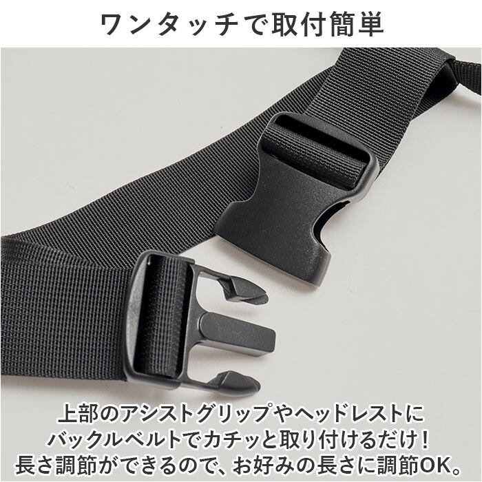 ・上部のアシストグリップやヘッドレストにバックルベルトでカチッと取り付けるだけ!長さ調節ができるので、お好みの長さに調節OK。