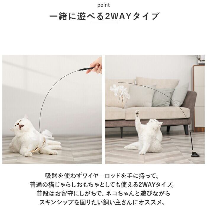 ・吸盤を使わずワイヤーロッドを手に持って、普通の猫じゃらしおもちゃとしても使える2WAYタイプ。普段はお留守にしがちで、ネコちゃんと遊びながらスキンシップを図りたい飼い主さんにオススメ。
