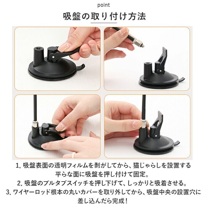 1.吸盤表面の透明フィルムを剥がしてから、猫じゃらしを設置する平らな面に吸盤を押し付けて固定。