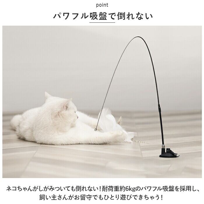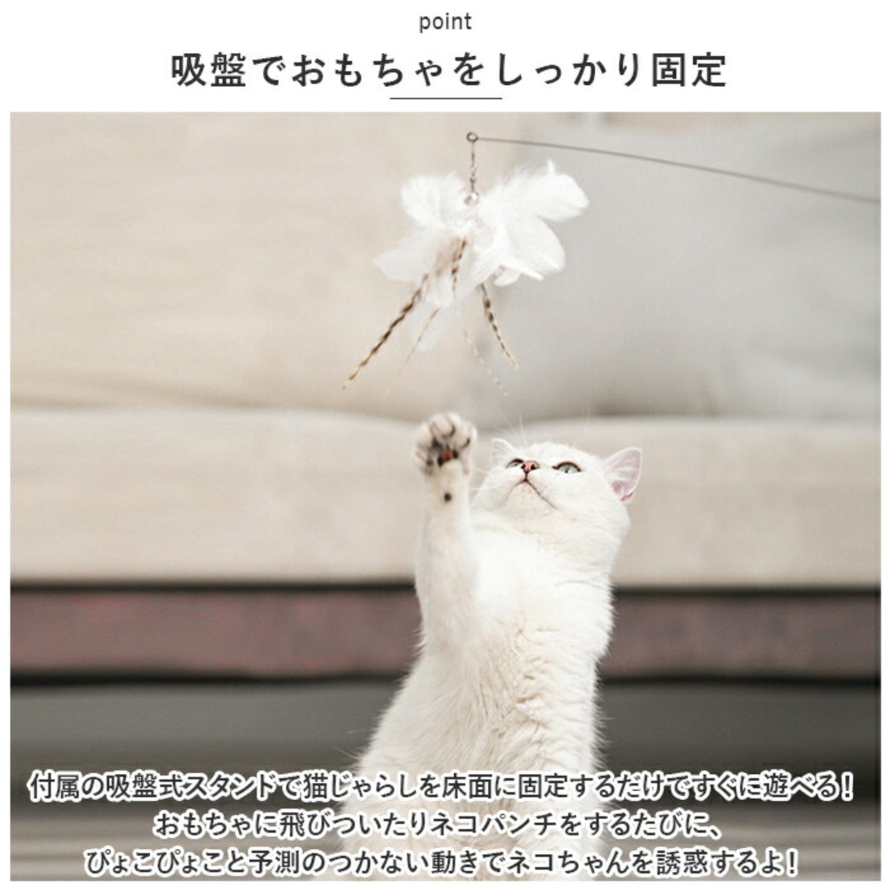 ・付属の吸盤式スタンドで猫じゃらしを床面に固定するだけですぐに遊べる!おもちゃに飛びついたりネコパンチをするたびに、ぴょこぴょこと予測のつかない動きでネコちゃんを誘惑するよ!