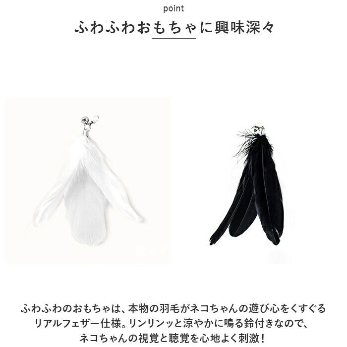 ・ふわふわのおもちゃは、本物の羽毛がネコちゃんの遊び心をくすぐるリアルフェザー仕様。リンリンッと涼やかに鳴る鈴付きなので、ネコちゃんの視覚と聴覚を心地よく刺激!