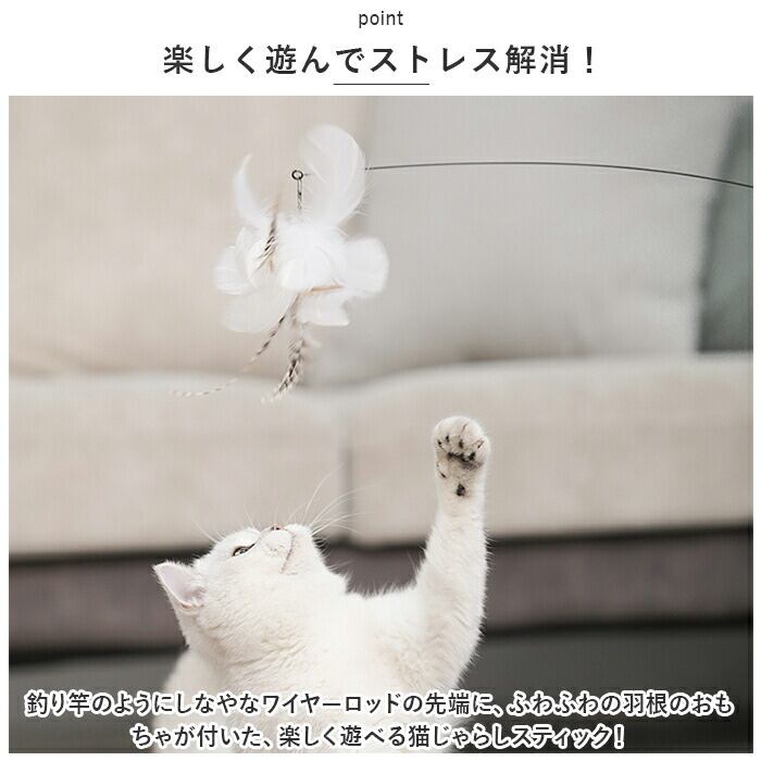 ・釣り竿のようにしなやなワイヤーロッドの先端に、ふわふわの羽根のおもちゃが付いた、楽しく遊べる猫じゃらしスティック!