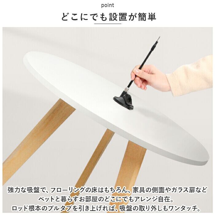 ・強力な吸盤で、フローリングの床はもちろん、家具の側面やガラス扉などペットと暮らすお部屋のどこにでもアレンジ自在。ロッド根本のプルタブを引き上げれば、吸盤の取り外しもワンタッチ。