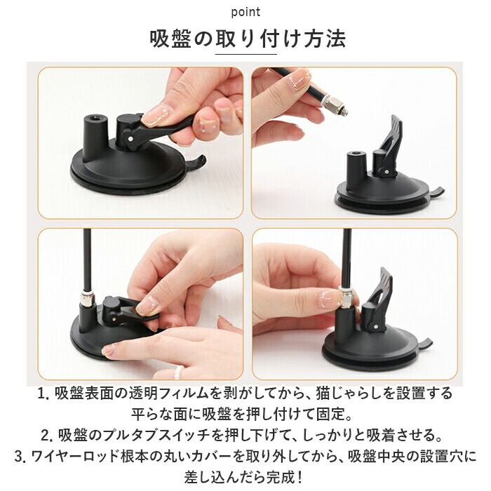 1.吸盤表面の透明フィルムを剥がしてから、猫じゃらしを設置する平らな面に吸盤を押し付けて固定。