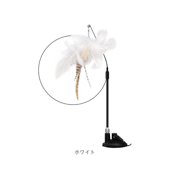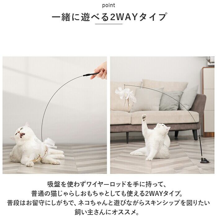 ・吸盤を使わずワイヤーロッドを手に持って、普通の猫じゃらしおもちゃとしても使える2WAYタイプ。普段はお留守にしがちで、ネコちゃんと遊びながらスキンシップを図りたい飼い主さんにオススメ。