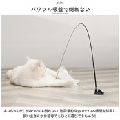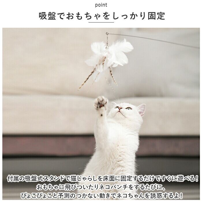 ・付属の吸盤式スタンドで猫じゃらしを床面に固定するだけですぐに遊べる!おもちゃに飛びついたりネコパンチをするたびに、ぴょこぴょこと予測のつかない動きでネコちゃんを誘惑するよ!