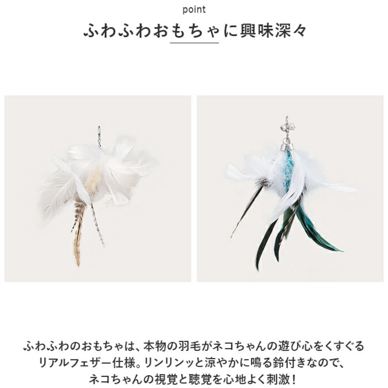 ・ふわふわのおもちゃは、本物の羽毛がネコちゃんの遊び心をくすぐるリアルフェザー仕様。リンリンッと涼やかに鳴る鈴付きなので、ネコちゃんの視覚と聴覚を心地よく刺激!