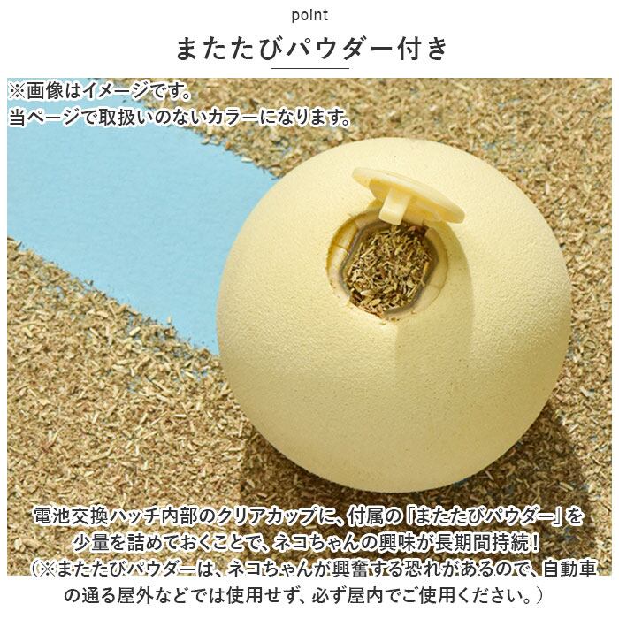 ・電池交換ハッチ内部のクリアカップに、付属の「またたびパウダー」を少量を詰めておくことで、ネコちゃんの興味が長期間持続!(※またたびパウダーは、ネコちゃんが興奮する恐れがあるので、自動車の通る屋外などでは使用せず、必ず屋内でご使用ください。)