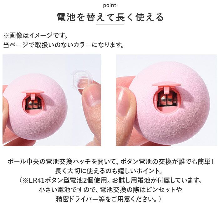 ・ボール中央の電池交換ハッチを開いて、ボタン電池の交換が誰でも簡単!長く大切に使えるのも嬉しいポイント。(※LR41ボタン型電池2個使用。お試し用電池が付属しています。小さい電池ですので、電池交換の際はピンセットや精密ドライバー等をご用意ください。)