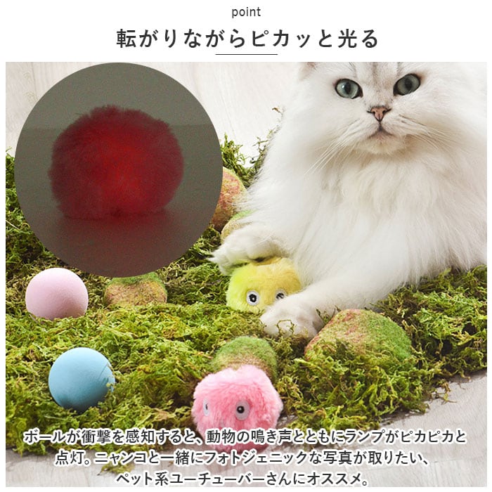 ・ボールが衝撃を感知すると、動物の鳴き声とともにランプがピカピカと点灯。ニャンコと一緒にフォトジェニックな写真が取りたい、ペット系ユーチューバーさんにオススメ。