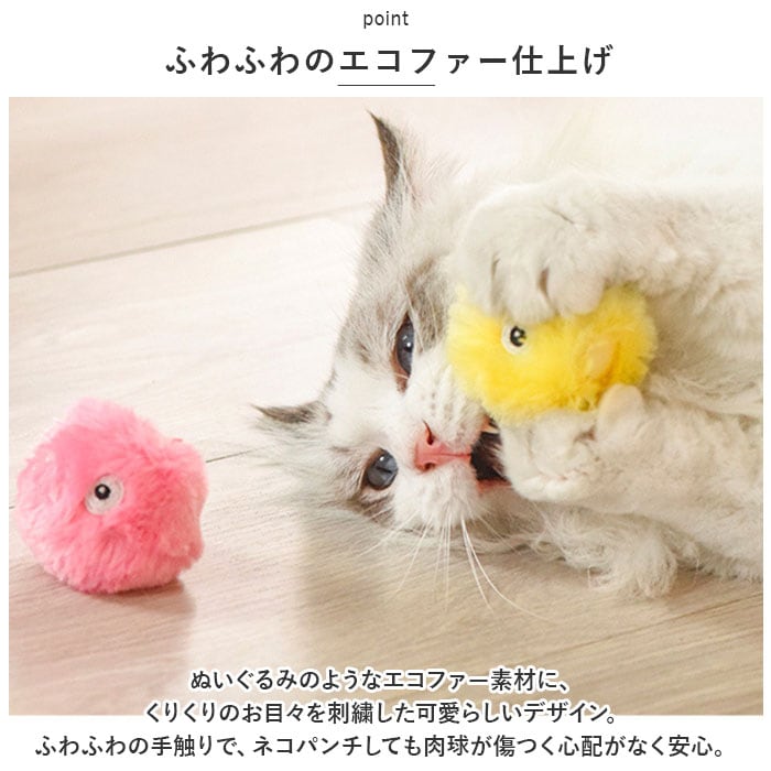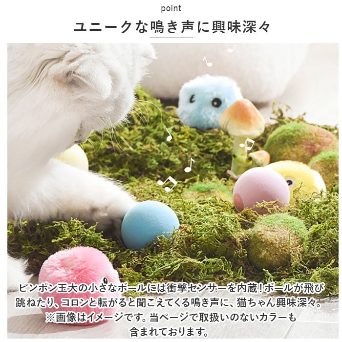 ・ピンポン玉大の小さなボールには衝撃センサーを内蔵!ボールが飛び跳ねたり、コロンと転がると聞こえてくる鳴き声に、猫ちゃん興味深々。