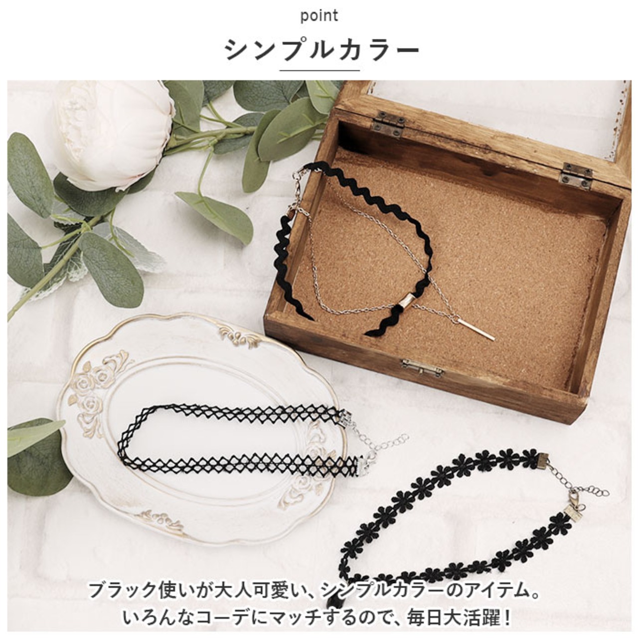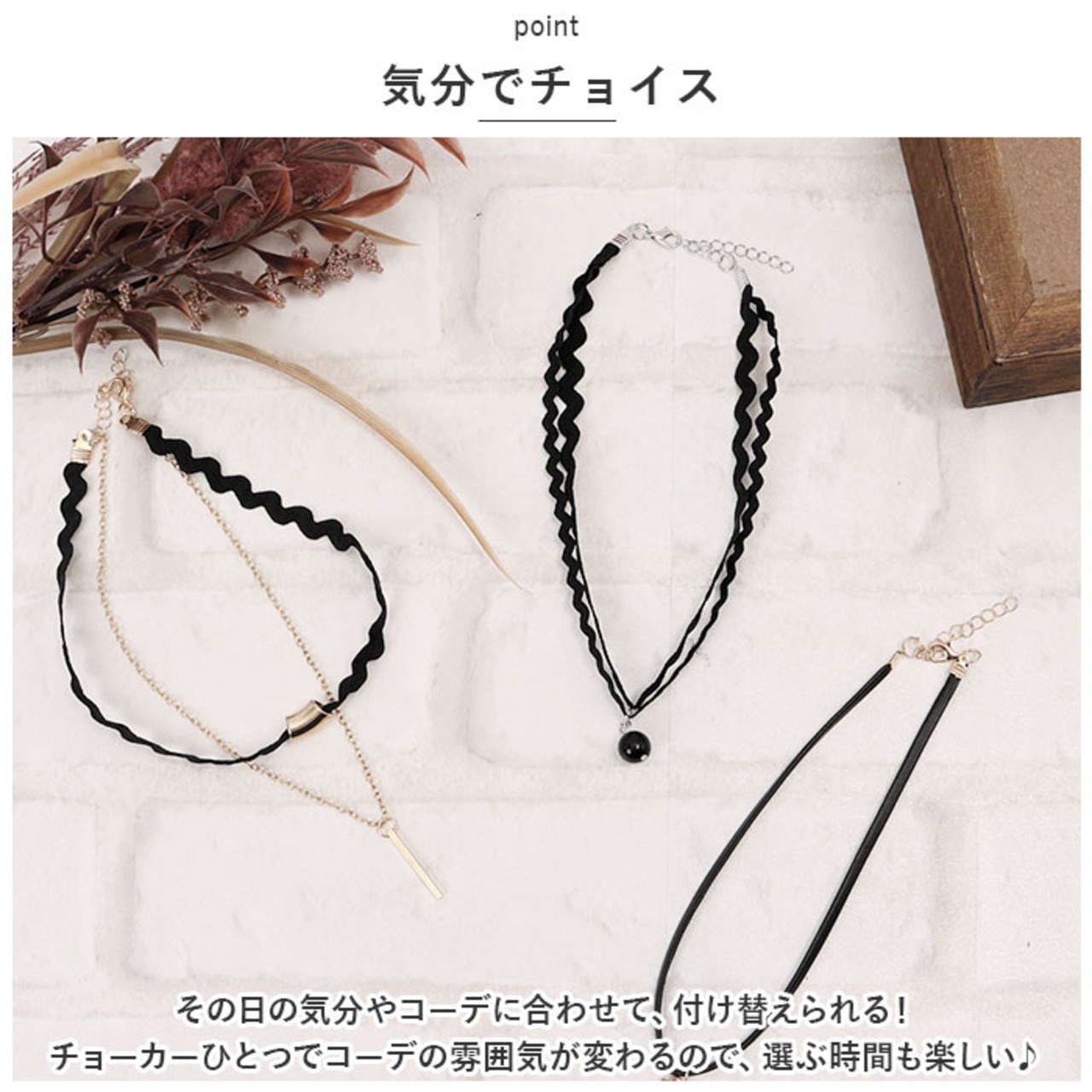 ・その日の気分やコーデに合わせて、付け替えられる!チョーカーひとつでコーデの雰囲気が変わるので、選ぶ時間も楽しい♪