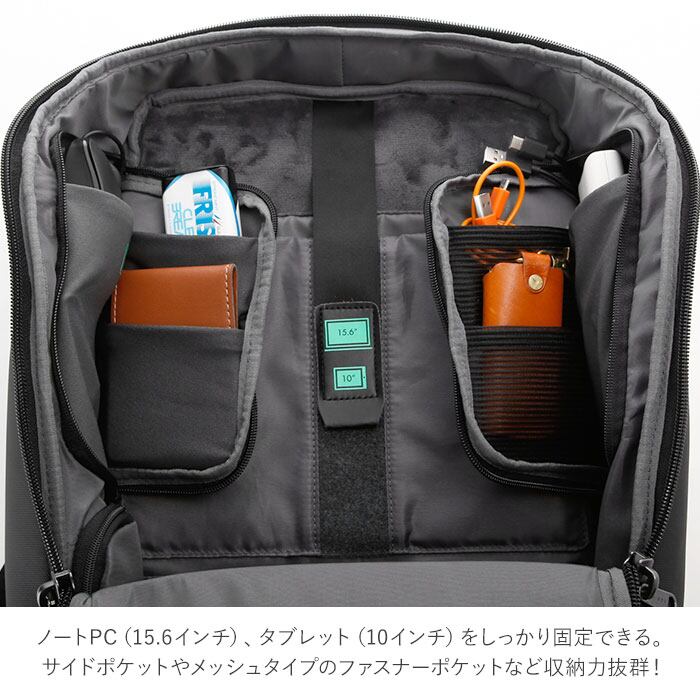 ・メイン収納スペース背面側には、ノートPC用ポケット(15.6インチ)、タブレット用ポケット(10インチ)を装備。ベルクロ式吊りベルトでしっかり固定できる。