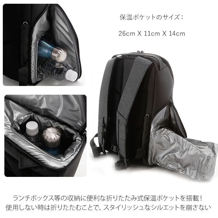 ・FLEX PACK PRO 最大の特徴は、左側面にペットボトルやランチボックスの収納に便利な折りたたみ式保温ポケットを搭載している点。使用しない時には折りたたむことが可能で、スタイリッシュなシルエット崩さない!