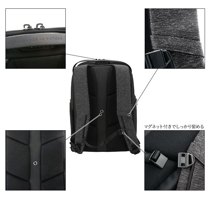 ・バックパック上部に、TSAダイヤルロック×ワイヤーによる盗難対策機能を搭載。開口部のファスナースライダーをロックできることに加え、50kgまでの引っ張りに耐えるワイヤーでしっかりと防犯対策。(※ワイヤーは背面向かって右側に配置)