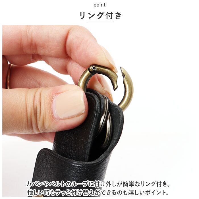 ・カバンやベルトのループに付け外しが簡単なリング付き。忙しい時もサッと付け替えができるのも嬉しいポイント。