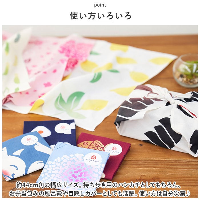 ・約44cm角の幅広サイズ。持ち歩き用のハンカチとしてもちろん、お弁当包みの風呂敷や目隠しカバーとしても活躍。使い方は自分次第♪