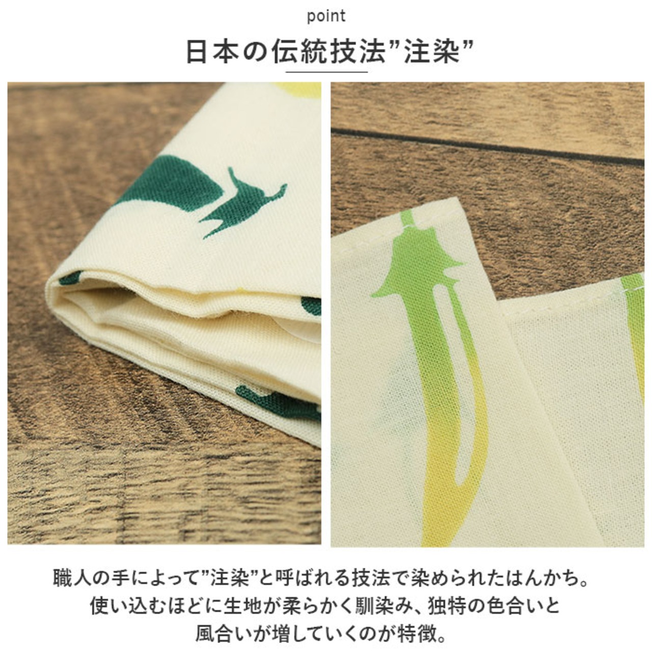 ・職人の手によって”注染”と呼ばれる技法で染められたはんかち。使い込むほどに生地が柔らかく馴染み、独特の色合いと風合いが増していくのが特徴。