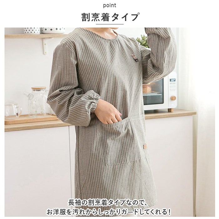 ・長袖の割烹着タイプなので、お洋服を汚れからしっかりガードしてくれる!