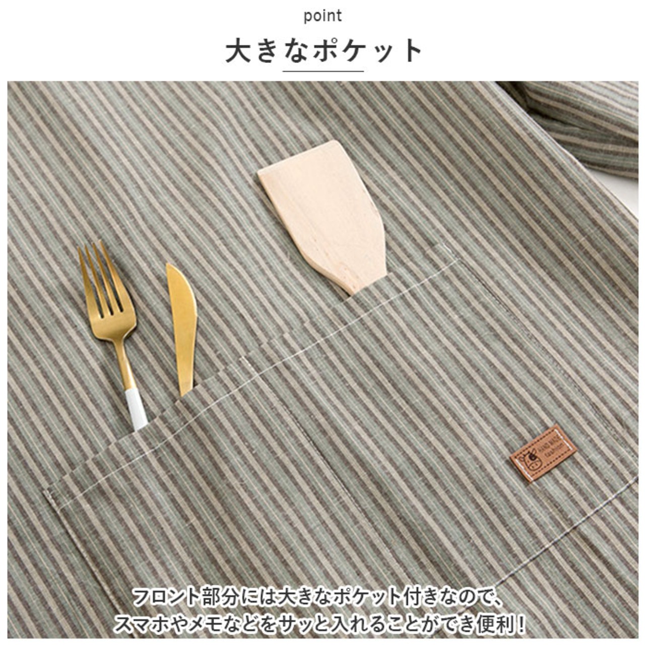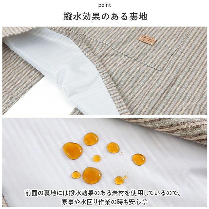 ・前面の裏地には撥水効果のある素材を使用しているので、家事や水回り作業の時も安心◎