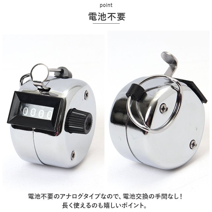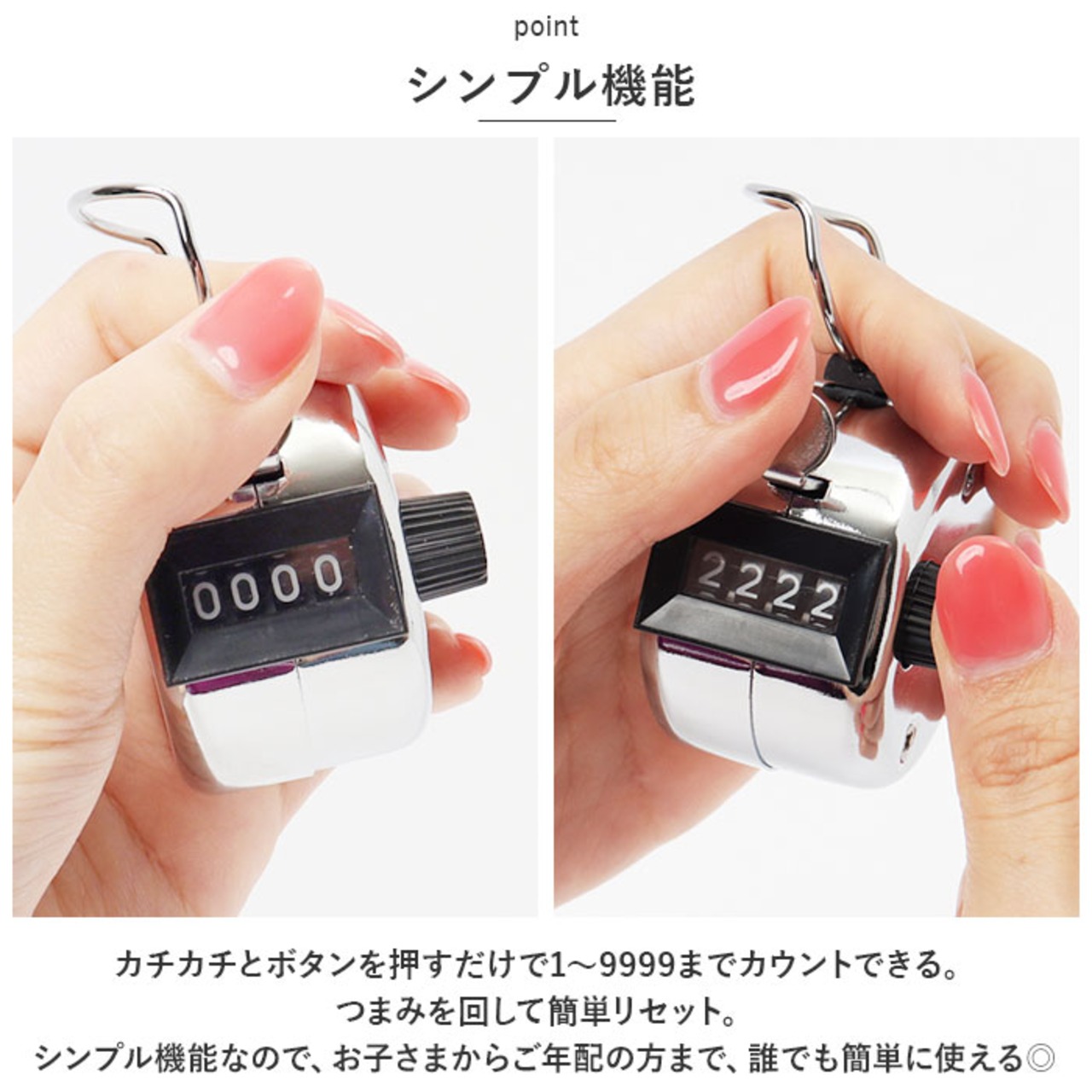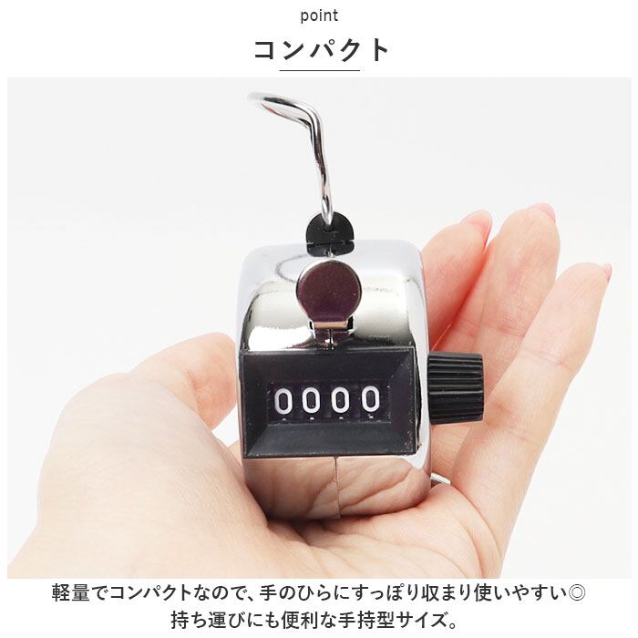 ・カチカチとボタンを押すだけで1~9999までカウントできる。つまみを回して簡単リセット。シンプル機能なので、お子さまからご年配の方まで、誰でも簡単に使える◎