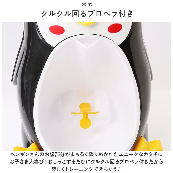 ・ペンギンさんのお腹部分がまぁるく繰りぬかれたユニークなカタチに、お子さま大喜び!おしっこするたびにクルクル回るプロペラ付きだから、楽しくトレーニングできちゃう♪