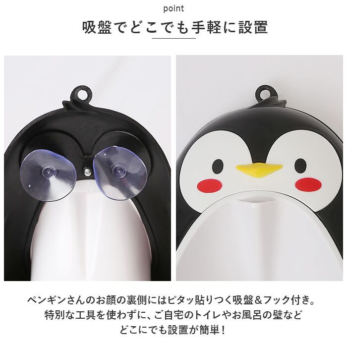 ・ペンギンさんのお顔の裏側にはピタッ貼りつく吸盤&フック付き。特別な工具を使わずに、ご自宅のトイレやお風呂の壁など、どこにでも設置が簡単!