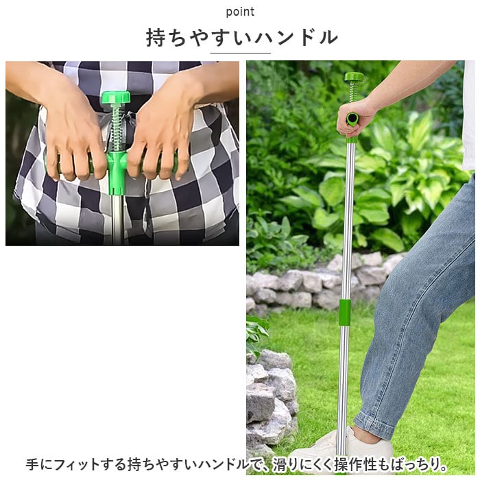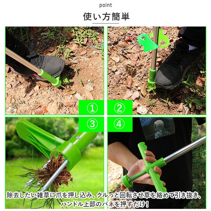 ・除去したい雑草に爪を押し込み、クルっと回転させ草を絡めて引き抜き、ハンドル上部のバネを押すだけ!
