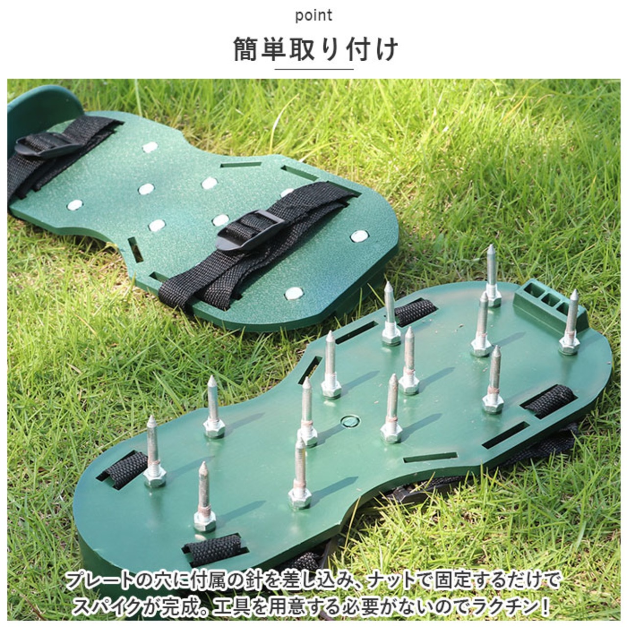 ・プレートの穴に付属の針を差し込み、ナットで固定するだけでスパイクが完成。工具を用意する必要がないのでラクチン!