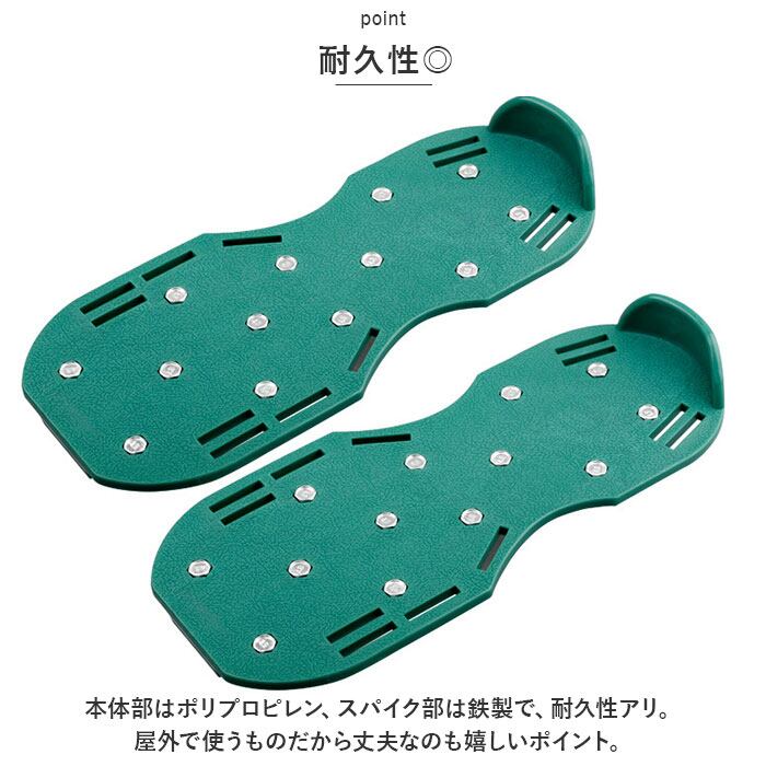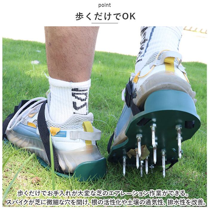 ・歩くだけでお手入れが大変な芝のエアレーション作業ができる。スパイクが芝に微細な穴を開け、根の活性化や土壌の通気性、排水性を改善◎