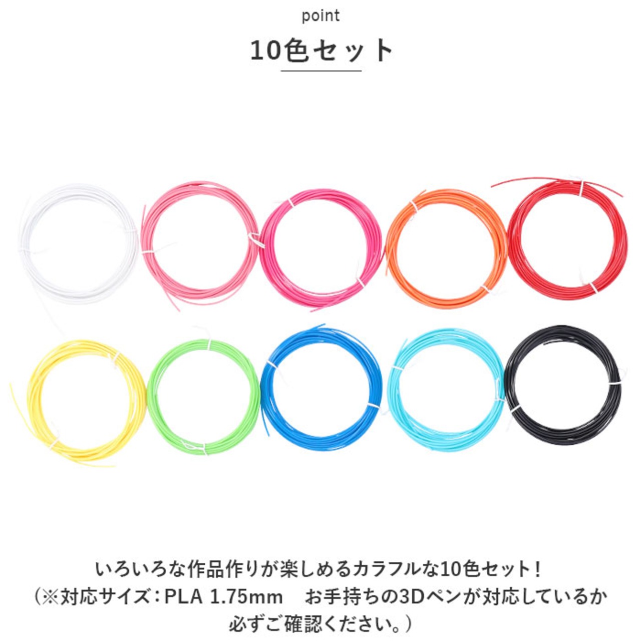 ・いろいろな作品作りが楽しめるカラフルな10色セット!(※対応サイズ:PLA 1.75mm お手持ちの3Dペンが対応しているか必ずご確認ください。)