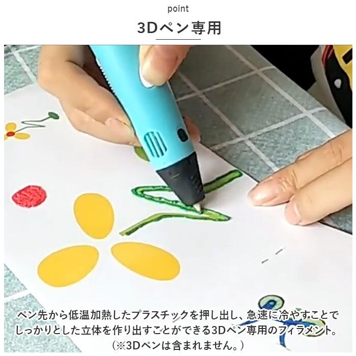 ・ペン先から低温加熱したプラスチックを押し出し、急速に冷やすことでしっかりとした立体を作り出すことができる3Dペン専用のフィラメント。(※3Dペンは含まれません。)