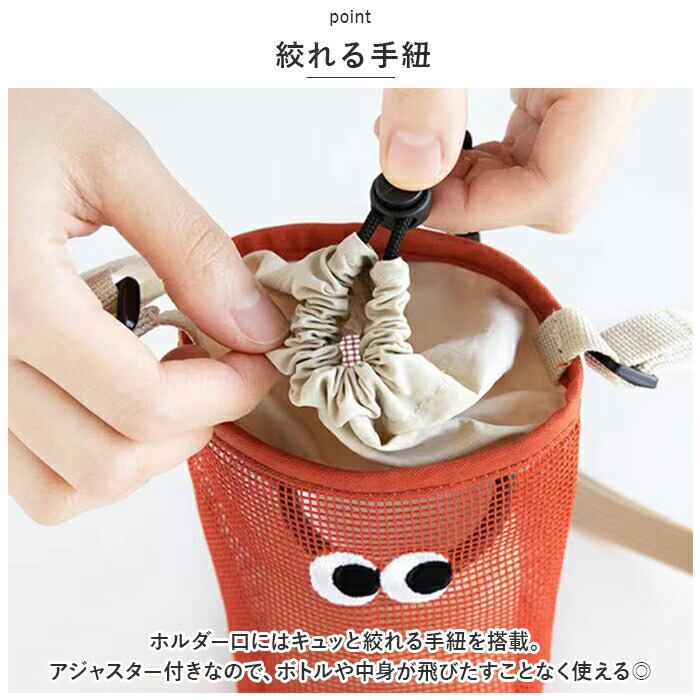 ・ホルダー口にはキュッと絞れる手紐を搭載。アジャスター付きなので、ボトルや中身が飛びたすことなく使える◎