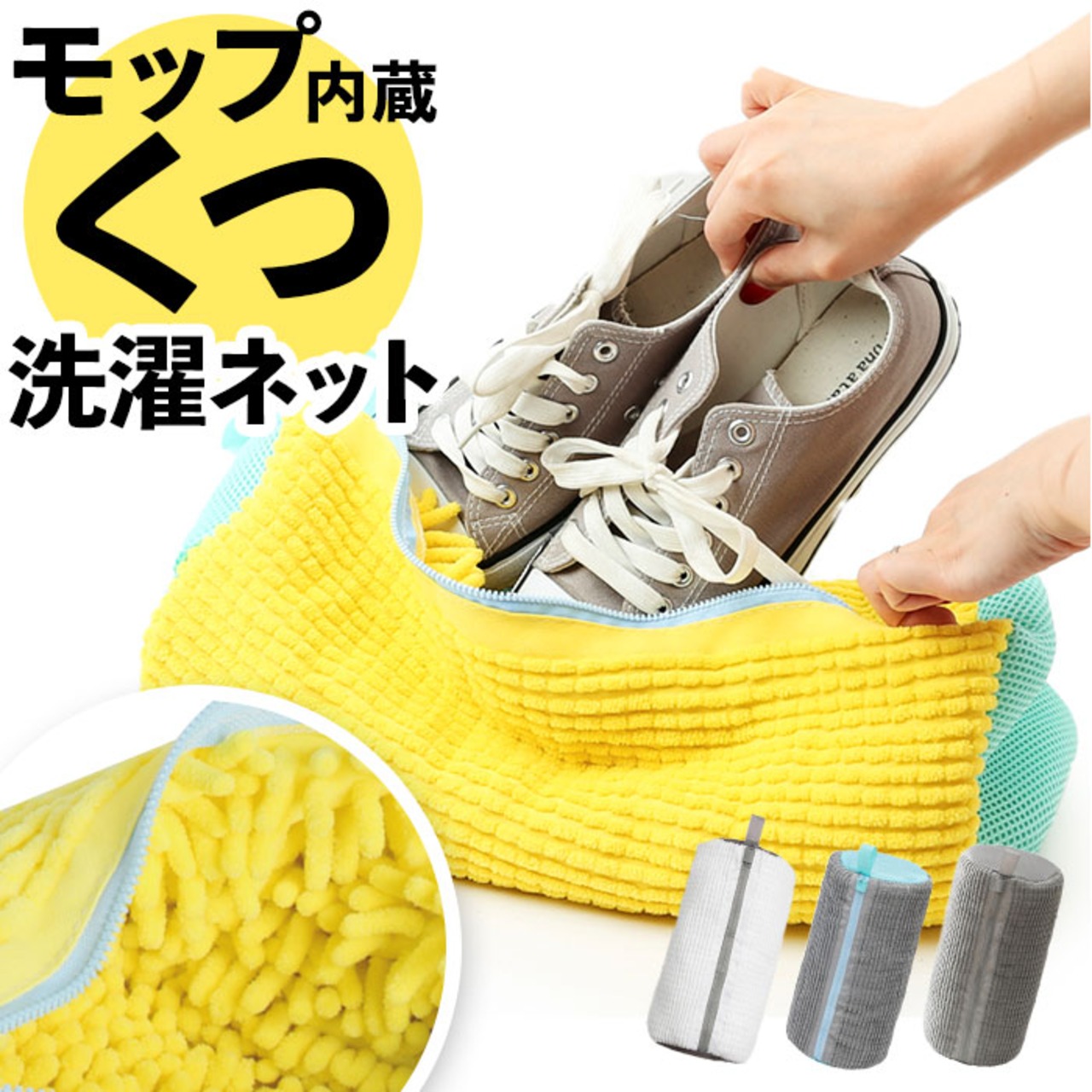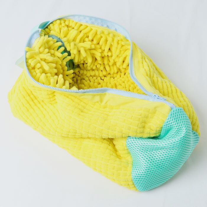 ・毛足の長いマイクロファイバー生地を内側に内蔵!靴をネットの中に入れて洗濯機にIN。水流でモップが汚れを落としてくれる仕組み。