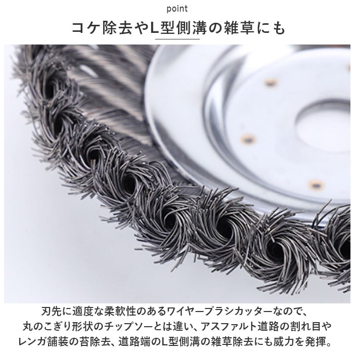 ・刃先に適度な柔軟性のあるワイヤーブラシカッターなので、丸のこぎり形状のチップソーとは違い、アスファルト道路の割れ目やレンガ舗装の苔除去、道路端のL型側溝の雑草除去にも威力を発揮。