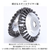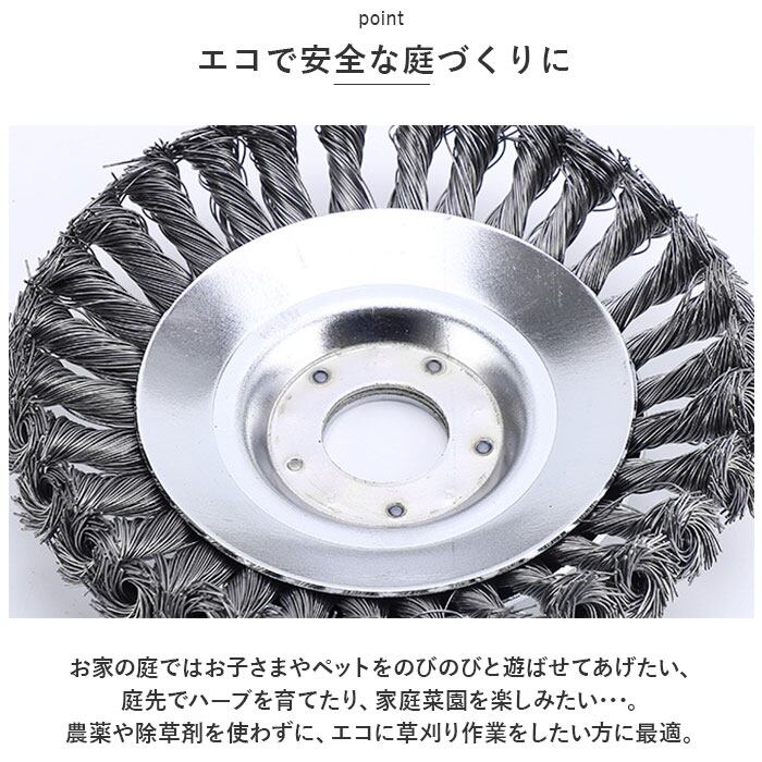 ・頑丈なスチールワイヤーにツイスト加工を施した、耐久性抜群のブラシカッタータイプ。いつの間にか地面にはびこる、頑固な雑草たちをスムーズに駆逐可能!