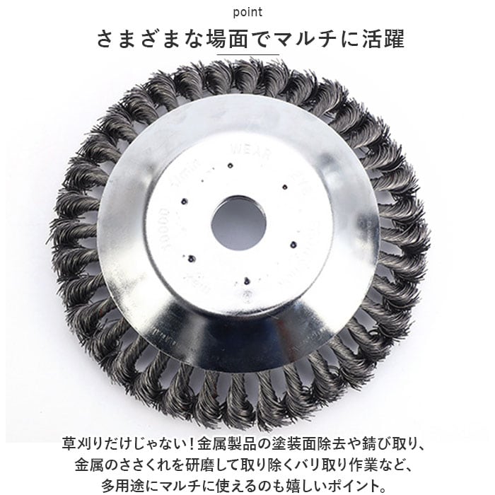 ・草刈りだけじゃない!金属製品の塗装面除去や錆び取り、金属のささくれを研磨して取り除くバリ取り作業など、多用途にマルチに使えるのも嬉しいポイント。