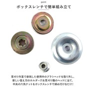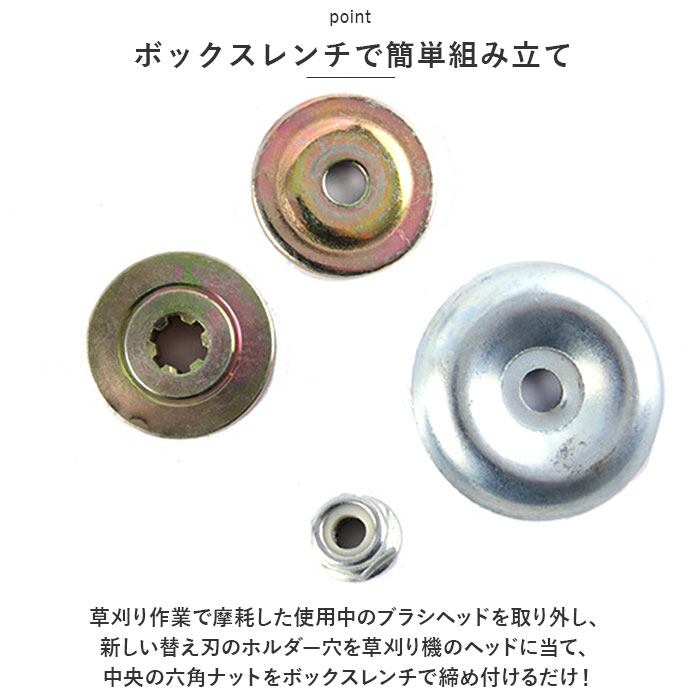 ・草刈り作業で摩耗した使用中のブラシヘッドを取り外し、新しい替え刃のホルダー穴を草刈り機のヘッドに当て、中央の六角ナットをボックスレンチで締め付けるだけ!(※ヘッド交換にはボックスレンチが必要です。ボックスレンチ、六角ナットは付属していません。)