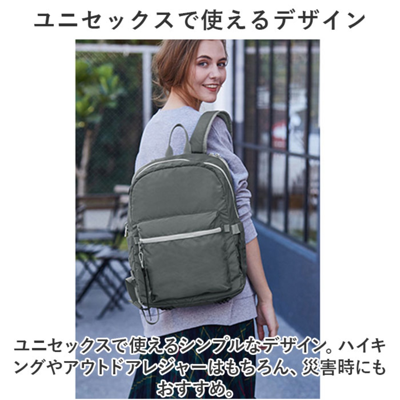 ・ユニセックスで使えるシンプルなデザイン。ハイキングやアウトドアレジャーはもちろん、災害時にもおすすめ。
