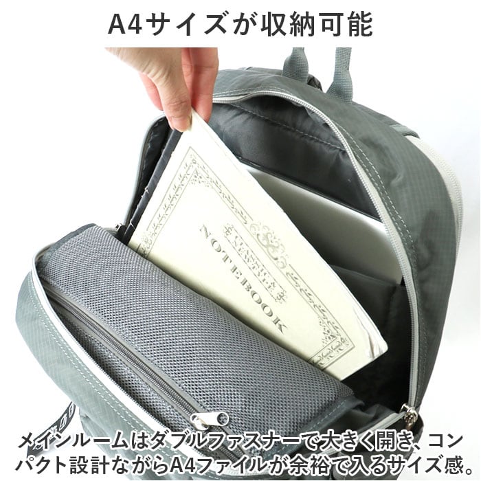 ・メインルームはダブルファスナーで大きく開き、コンパクト設計ながらA4ファイルが余裕で入るサイズ感。