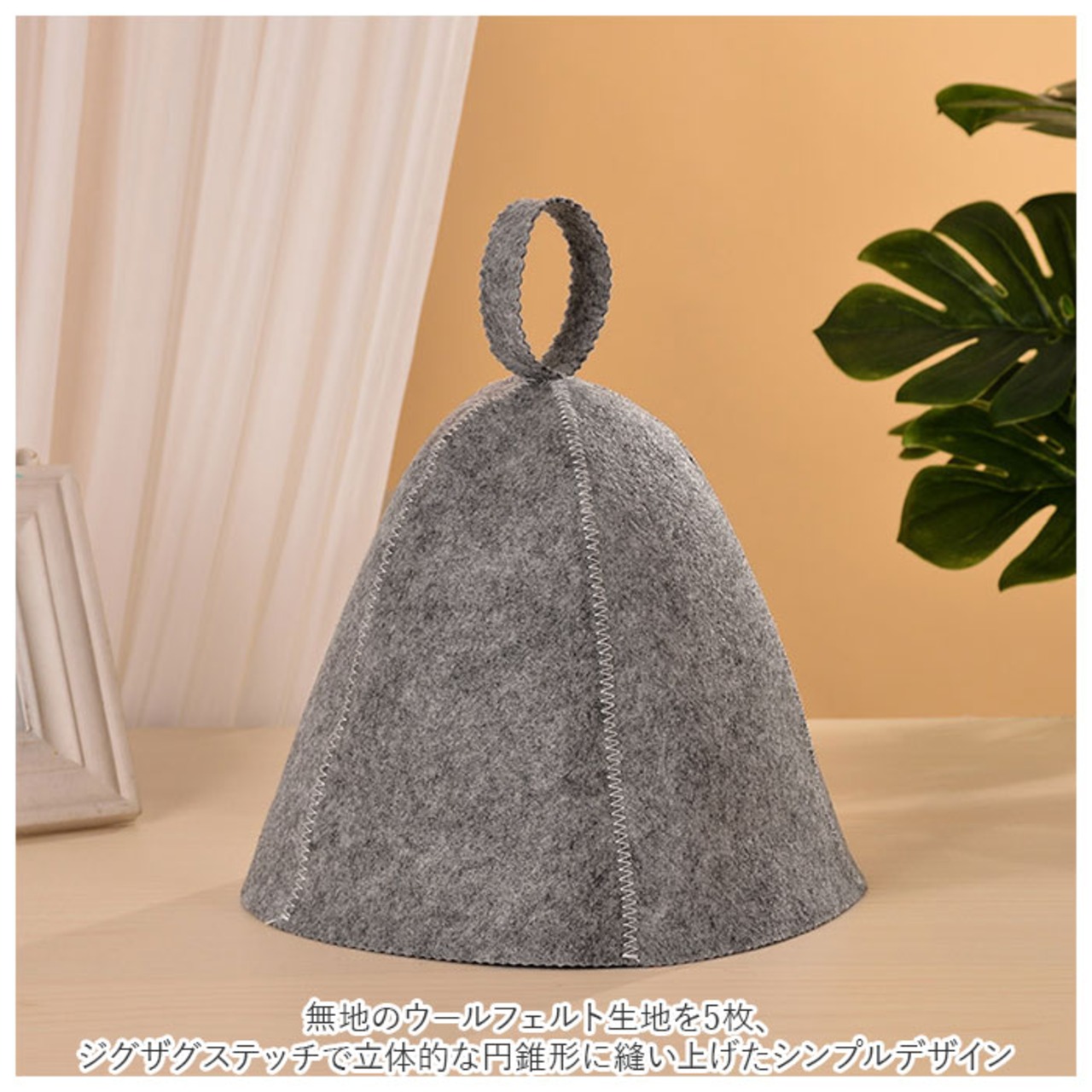 ・無地のウールフェルト生地を5枚、ジグザグステッチで立体的な円錐形に縫い上げたシンプルデザイン。