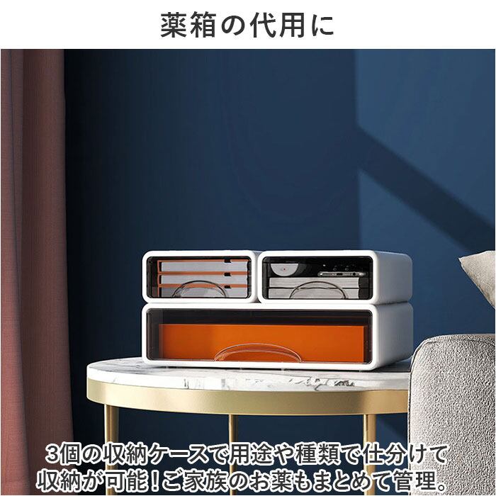 ・3個の収納ケースで用途や種類で仕分けて収納が可能!ご家族のお薬もまとめて管理。