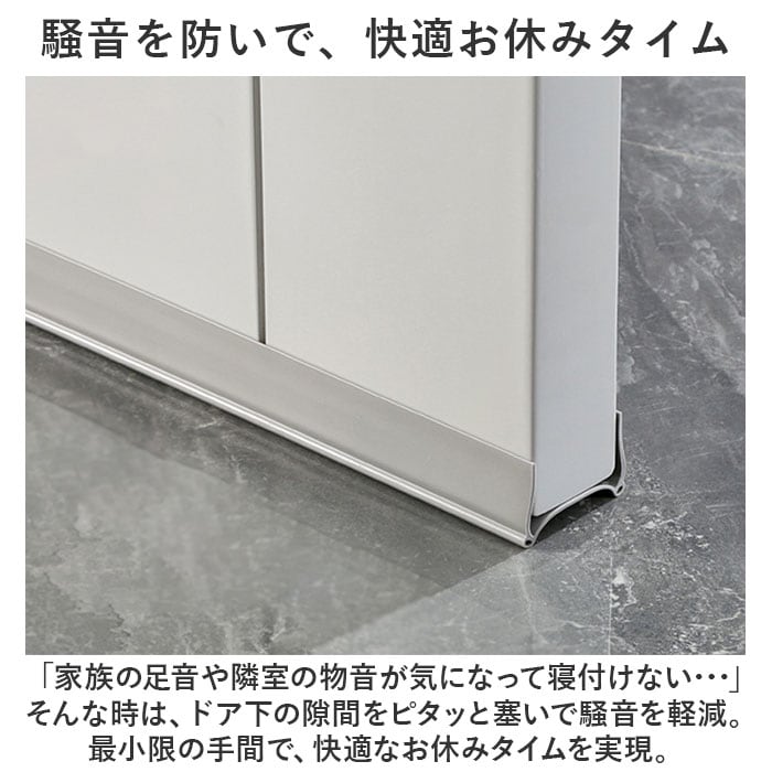 ・「家族の足音や隣室の物音が気になって寝付けない・・・」そんな時は、ドア下の隙間をピタッと塞いで騒音を軽減。最小限の手間で、快適なお休みタイムを実現。