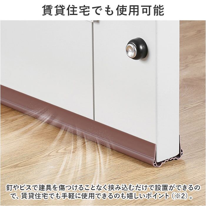※1.程よい伸縮性で、厚み約3.5cm~約5.0cmのドアに自在にフィット。・・・(※ドア下のすき間0.3cm~1.5cmに対応。ドア下に敷居のない、フラットな床面でご使用いただけます。)