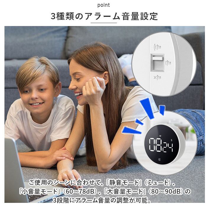 ・ご使用のシーンに合わせて、「静音モード」(ミュート)、「小音量モード」(60~78dB)、「大音量モード」(80~90dB)の3段階にアラーム音量の調整が可能。