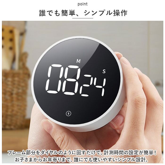 ・フレーム部分をダイヤルのように回すだけで、計測時間の設定が簡単!お子さまからお年寄りまで、誰にでも使いやすいシンプル設計。