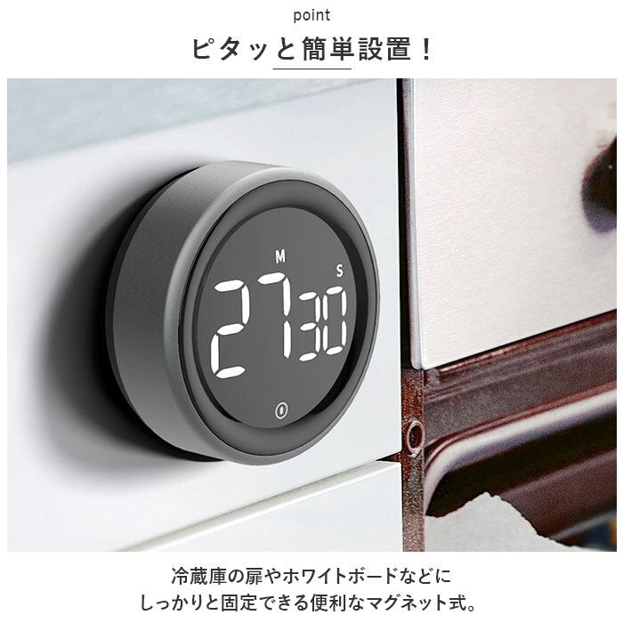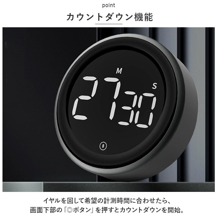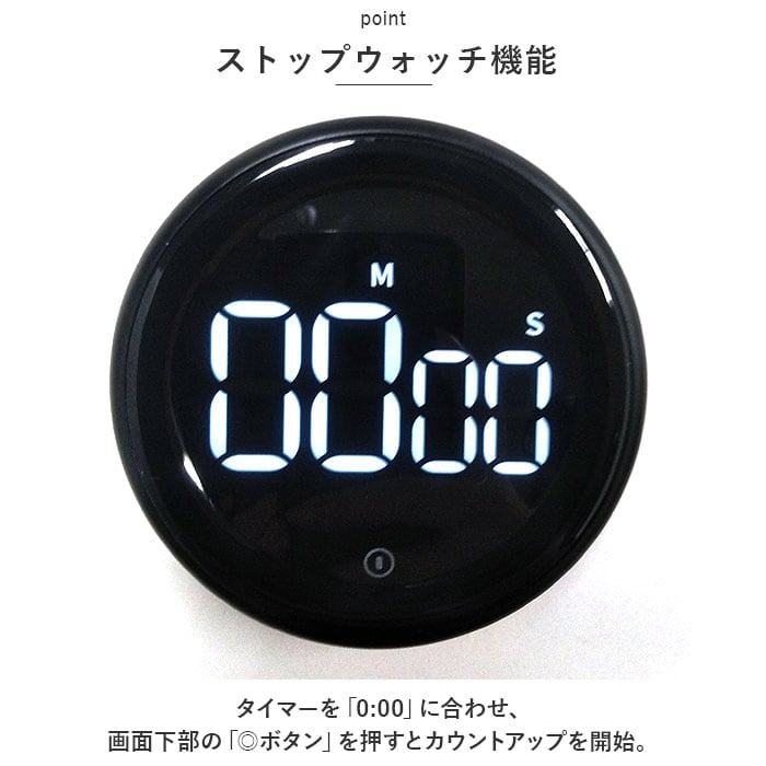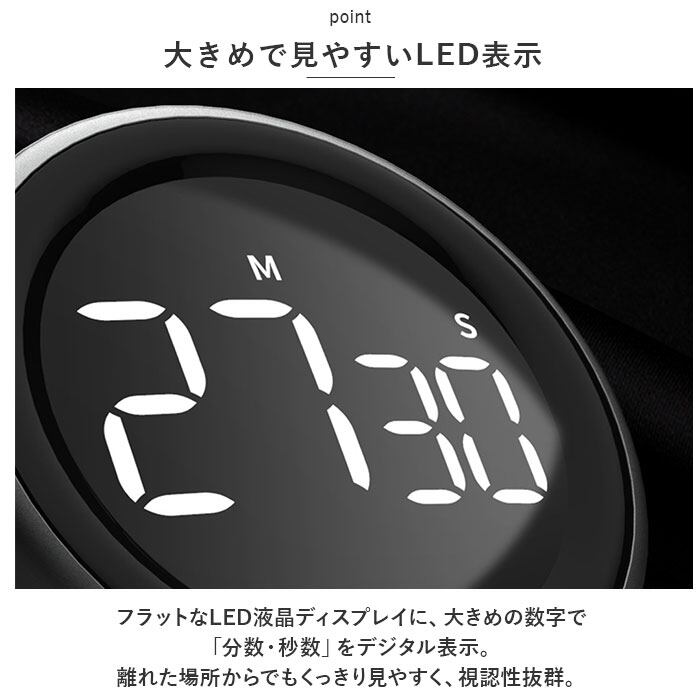 ・フラットなLED液晶ディスプレイに、大きめの数字で「分数・秒数」をデジタル表示。離れた場所からでもくっきり見やすく、視認性抜群。
