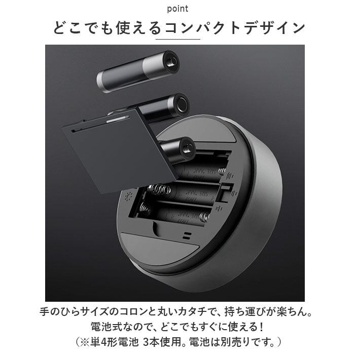・手のひらサイズのコロンと丸いカタチで、持ち運びが楽ちん。電池式なので、どこでもすぐに使える!(※単4形電池 3本使用。電池は別売りです。)