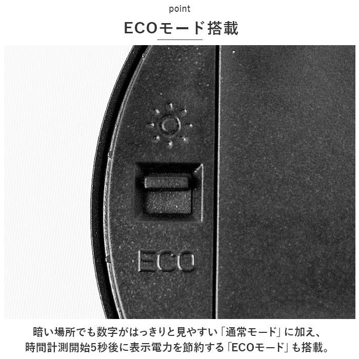・暗い場所でも数字がはっきりと見やすい「通常モード」に加え、時間計測開始5秒後に表示電力を節約する「ECOモード」も搭載。